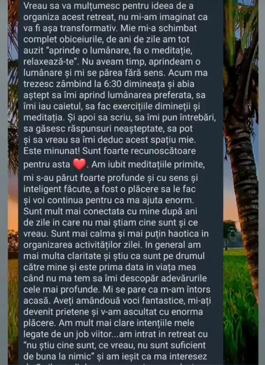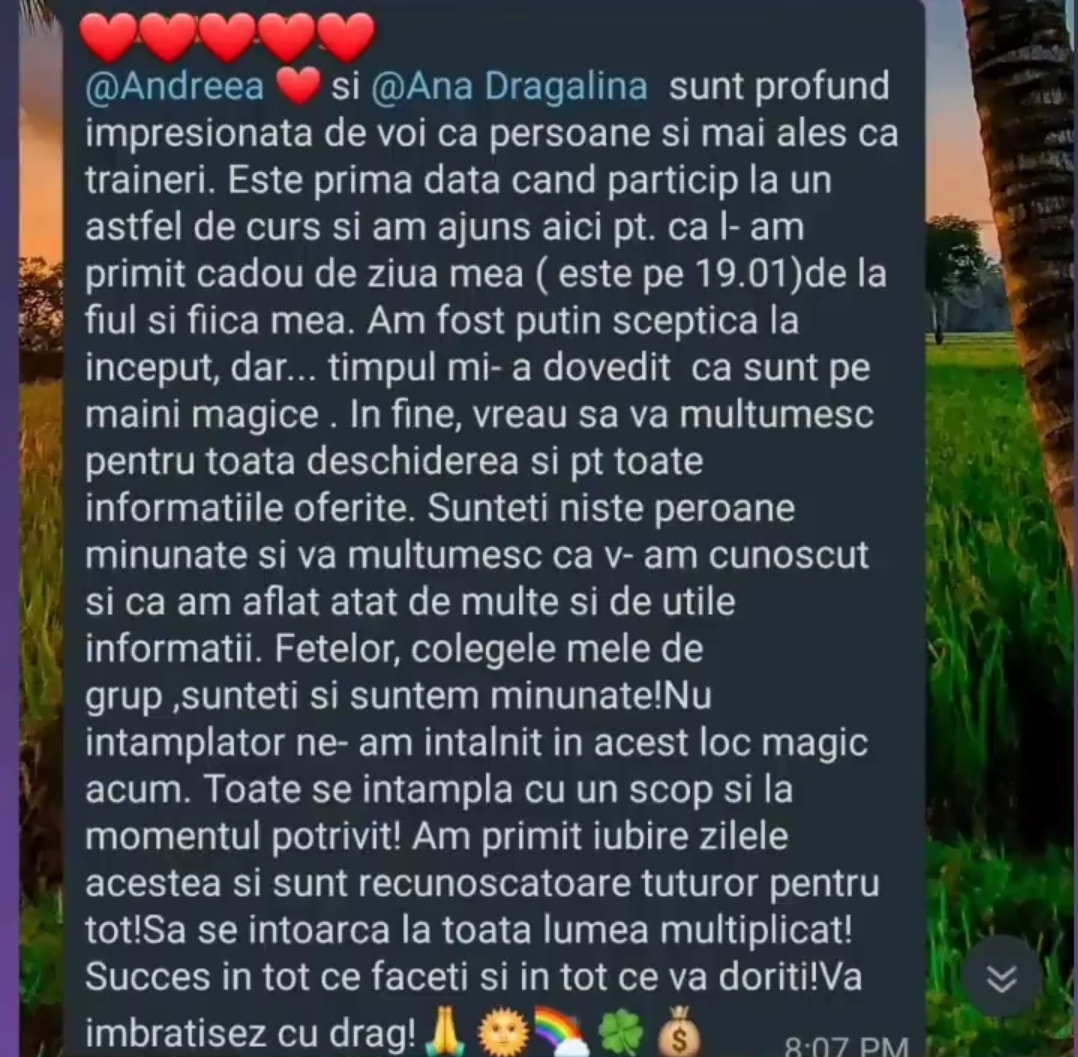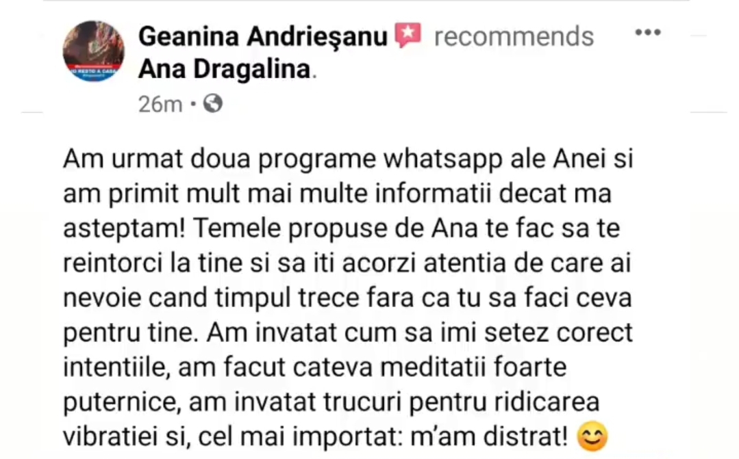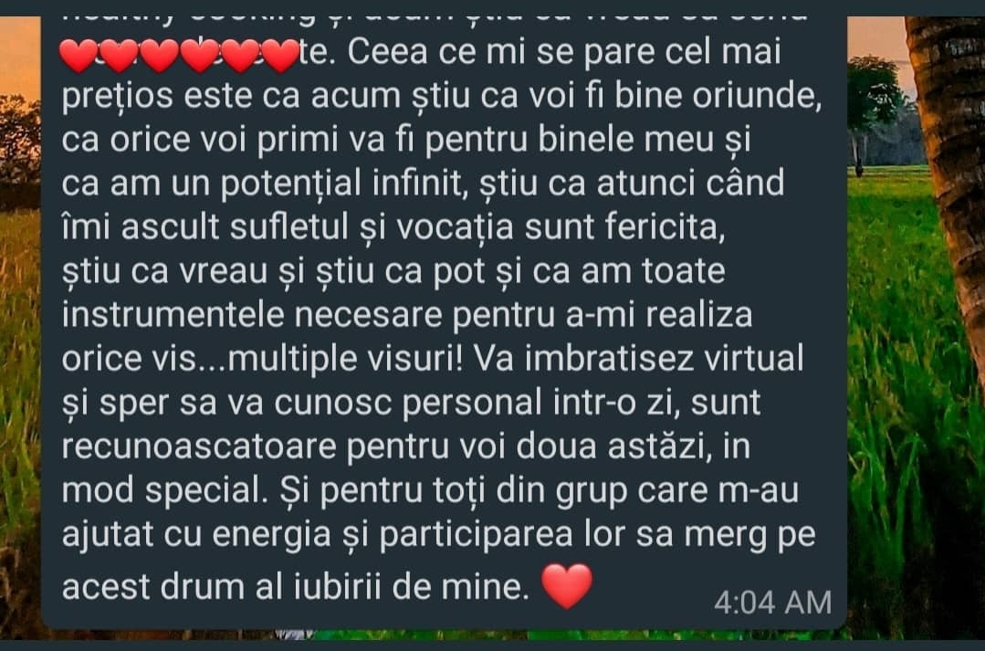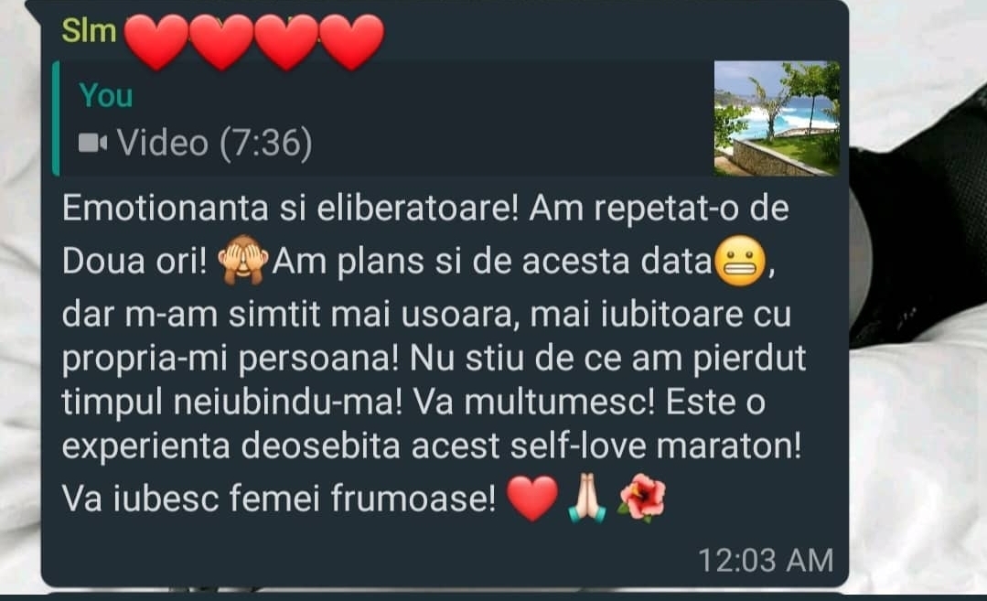 “Imi scriu sute de persoane pentru a-mi cere sfatul in diferite situatii de viata – relatii disfunctionale, visuri neimplinite, dezamagiri, imposibilitatea de a lua decizii radicale, de a iesi din situatii care nu ii fac fericiti, lipsa puterii de a se detasa de parteneri toxici si am constatat ca la toti le recomandam aceeasi “reteta” – Iubirea de sine. Aceeasi reteta pe care am aplicat-o si pe mine in toate domeniile vietii mele. Am vrut o schimbare in cariera? Puterea iubirii de sine m-a sustinut si mi-a aratat calea. Am vrut sa calatoresc si sa traiesc din scris – iubirea de sine m-a sustinut sa descopar cum pot sa fac asta. Am iesit din relatii nepotrivite din iubire de sine. Las forta vietii sa manifeste prin mine din iubire de sine. Iubirea de sine este iubirea de Dumnezeu si de tot ceea ce El a sadit in noi si manifesta acum in lume prin noi. Asa ca am creat un curs complet despre subiectul cel mai important in opinia mea, daca s-ar preda iubirea de sine in scoli, nimeni nu ar mai umbla prin lume cu ranile sangerand pe ceilalti.”