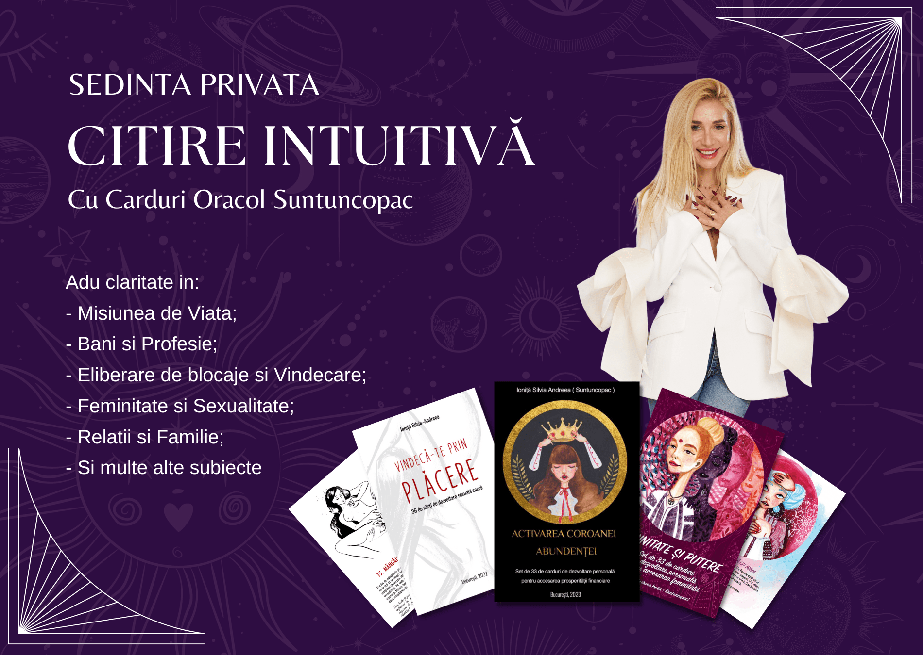 Iubesc cardurile oracol si mesajele lor, iar acum sunt atat de fericita pentru ca am propriile mele carduri oracol tarot care te pot ghida in aflarea raspunsurilor dorite! Cardurile mele de sexualitate, de feminitate si de abundenta, alaturi de alte carduri oracol pe care le voi alege intuitiv si mesajele care imi vor veni prin channeling, imi vor fi instrumente pentru citirea ta intuitiva speciala, in cadrul unei sedinte private.